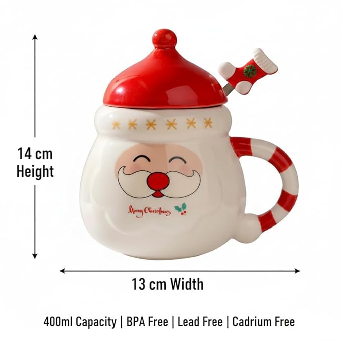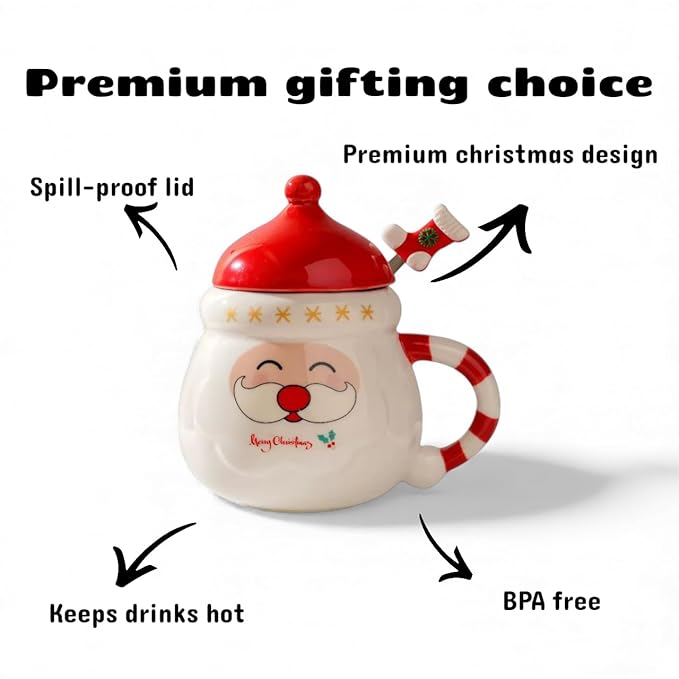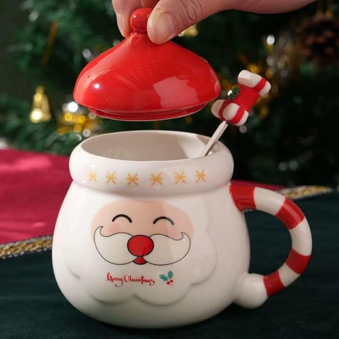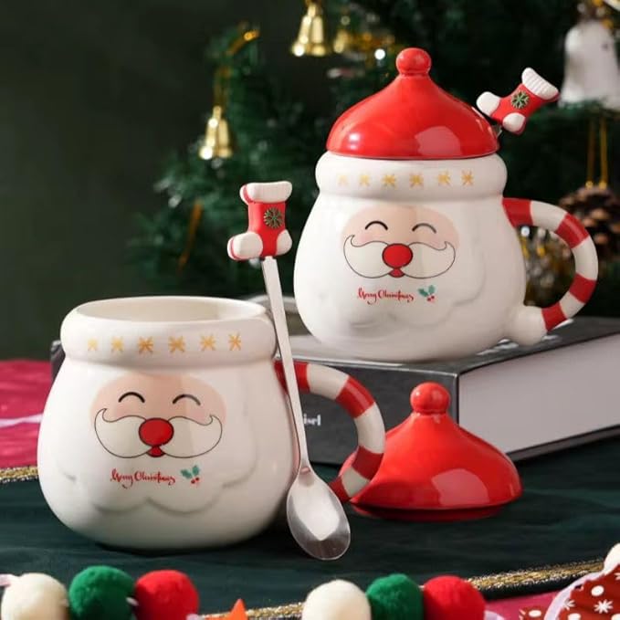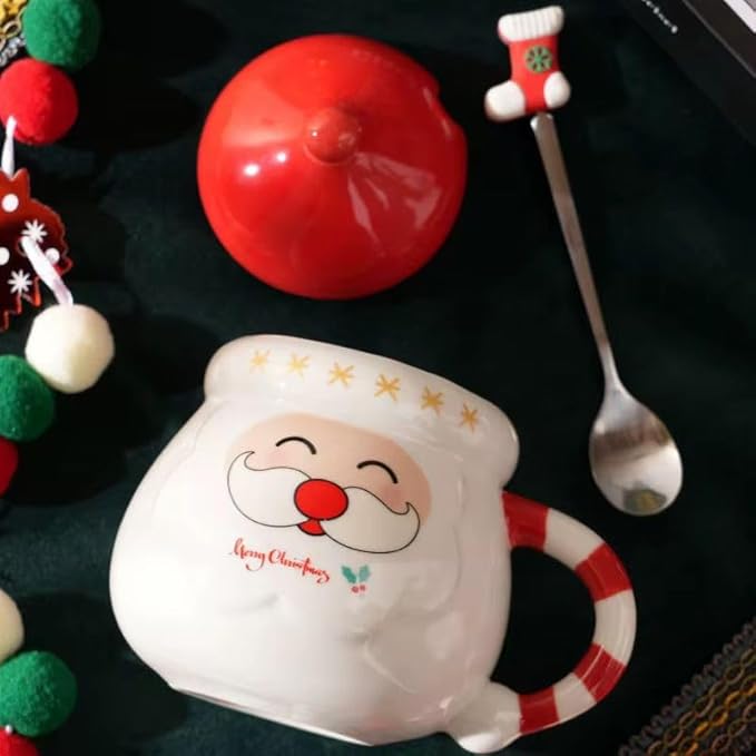 Christmas Holiday Collection, Ceramic Coffee Mugs and Cutlery Gift Set, 450ml Santa Design Mugs with Golden Stainless Steel Spoons, Holiday Theme (Santa with hat lid, White)