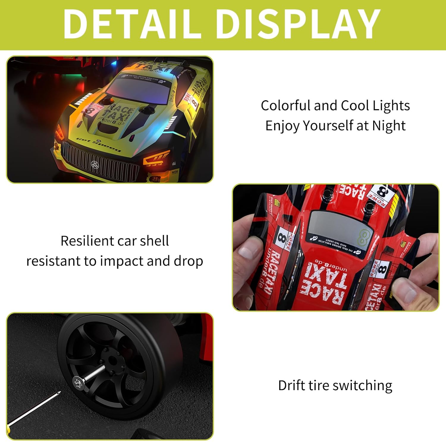 - Glowing Cool Drift Car : 1:20 scale fast remote control drift car with equipped with front, rear and tail lights, let the whole Car body shine making it cooler and more attractive when driving at night. The operation of the Rc drift car is also very simple. You can easily control the drift car forward, backward, turn left, turn right, etc. You can also perform various types of drift, such as U-shaped drift, S-shaped drift, 360-degree drift, each type Drifting will bring you different fun. This is a drift car suitable for all children and adults.
